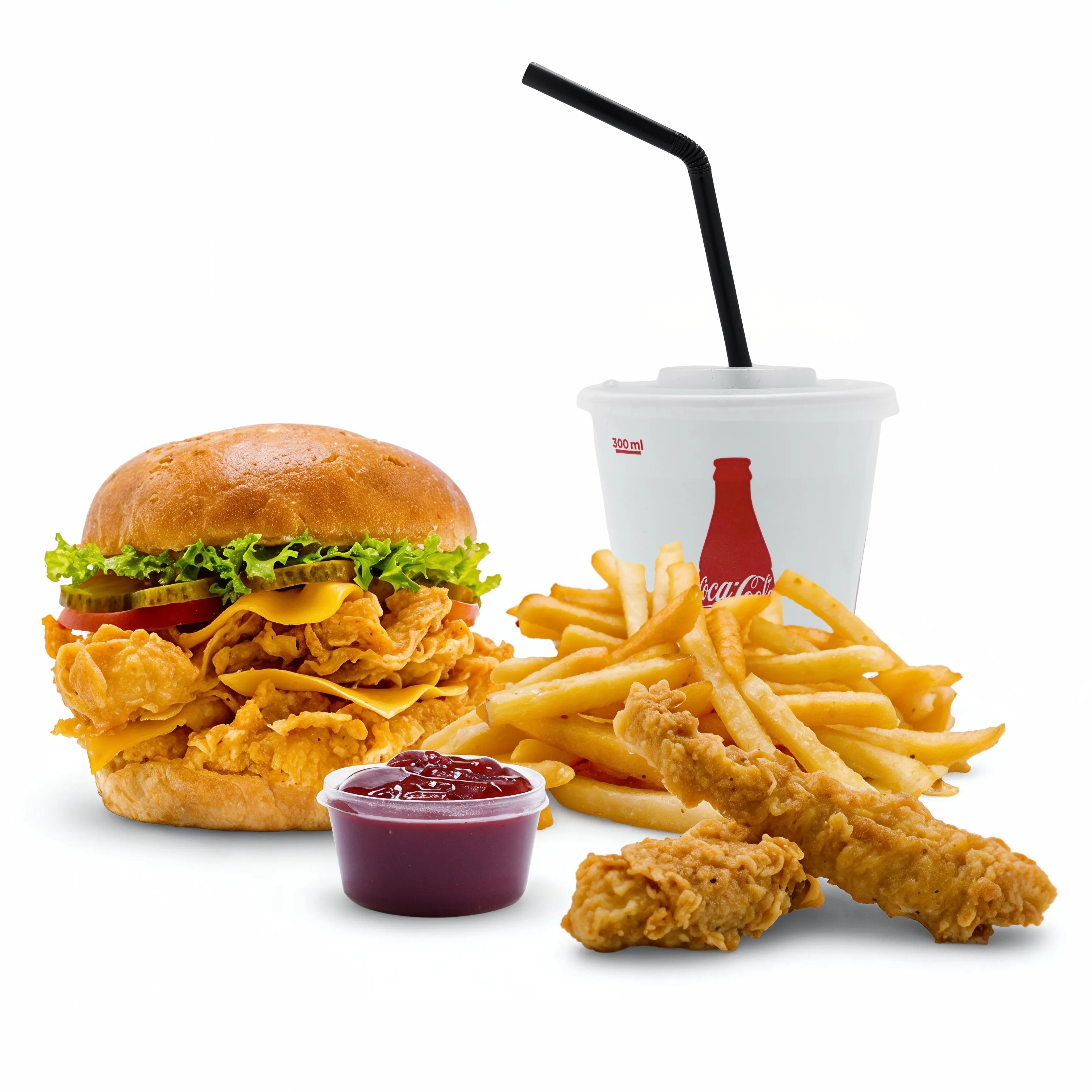 double chicken cheeseburger,small fries,small chicken strips,ketchup sauce,Coca-Cola 0.33ml