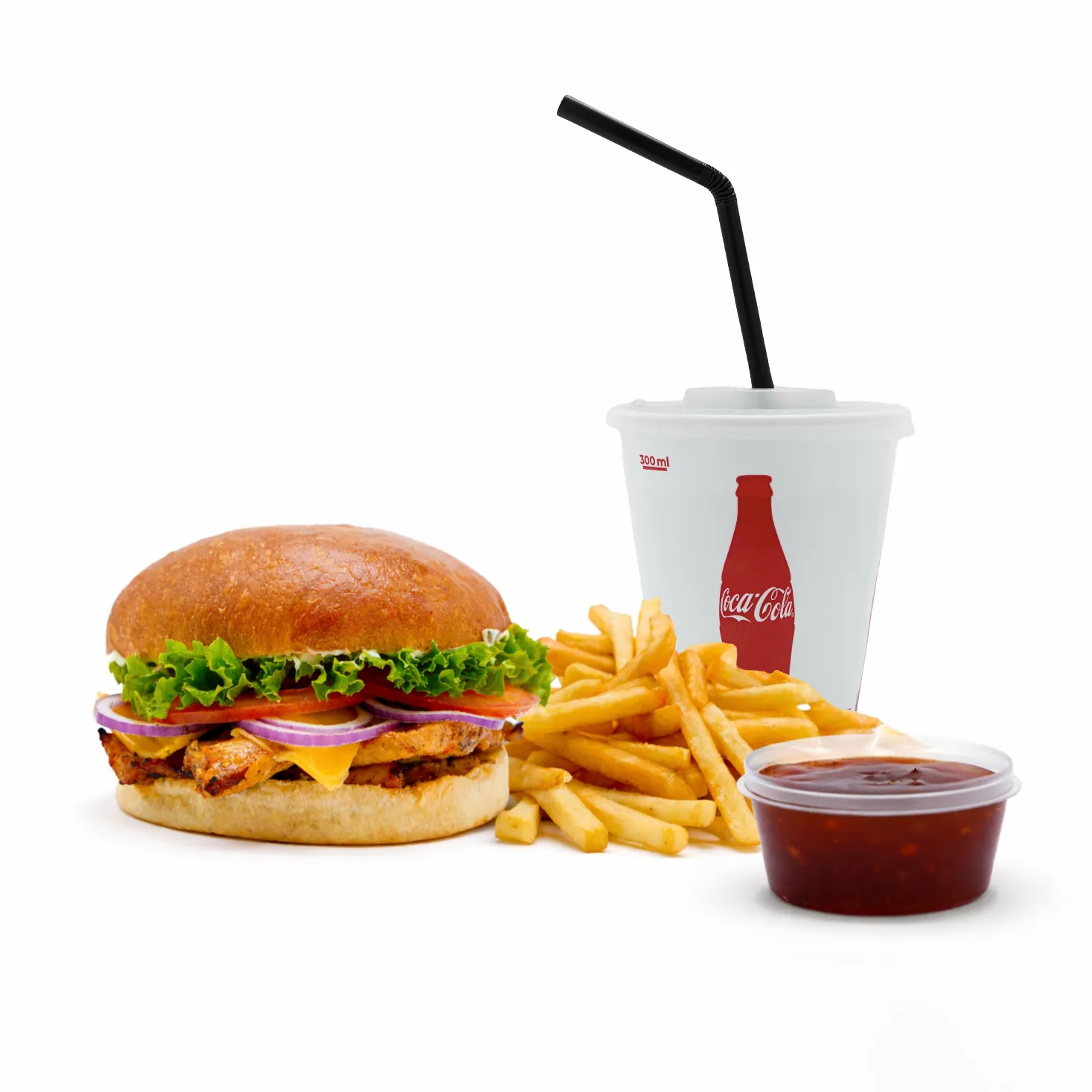 chicken steak burger,large fries,BBQ sauce,onion,Coca-Cola 0.33ml
